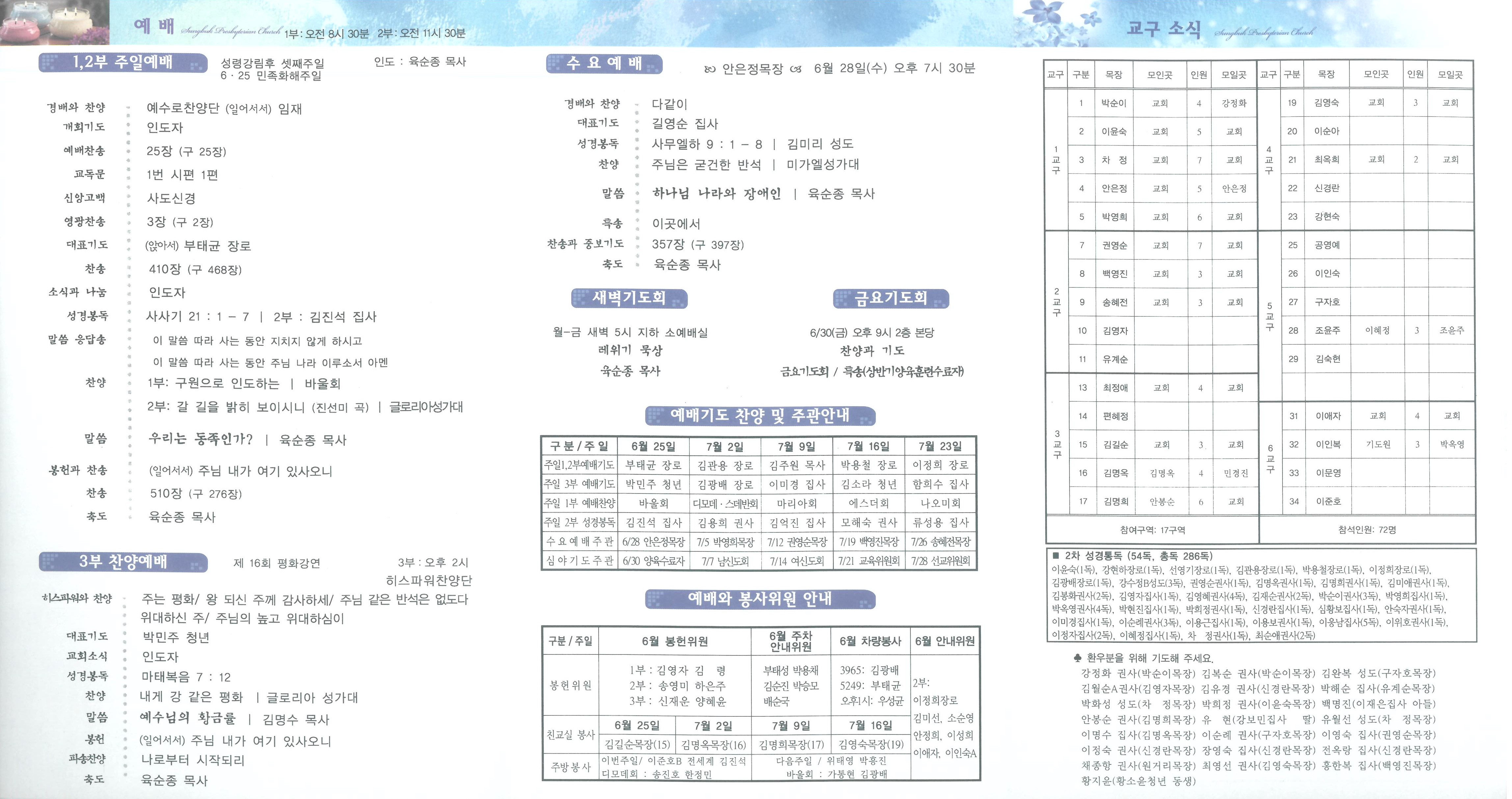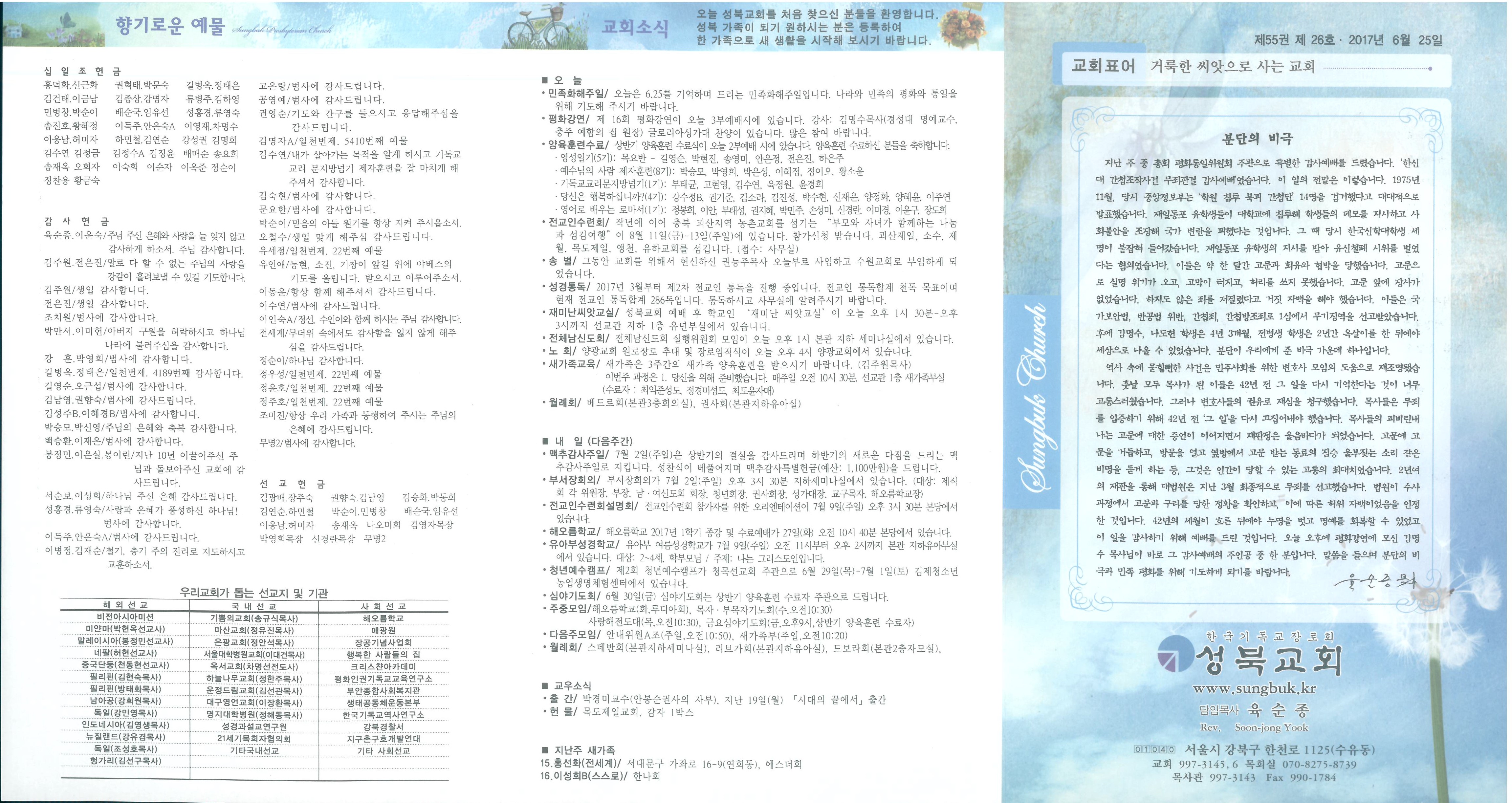 ■ 오 늘 ∙민족화해주일/ 오늘은 6.25를 기억하며 드리는 민족화해주일입니다. 나라와 민족의 평화와 통일을 위해 기도해 주시기 바랍니다. ∙평화강연/ 제 16회 평화강연이 오늘 3부예배시에 있습니다. 강사: 김명수목사(경성대 명예교수, 충주 예함의 집 원장) 글로리아성가대 찬양이 있습니다. 많은 참여 바랍니다. ∙양육훈련수료/ 상반기 양육훈련 수료식이 오늘 2부예배 시에 있습니다. 양육훈련 수료하신 분들을 축하합니다. ·영성일기(5기): 목요반 - 길영순, 박현진, 송영미, 안은정, 전은진, 하은주 ·예수님의 사람 제자훈련(8기): 박승모, 박영희, 박은성, 이혜정, 정이오, 황소윤 ·기독교교리문지방넘기(1기): 부태균, 고현영, 김수연, 육정원, 윤경희 ·당신은 행복하십니까?(4기): 강수정B, 권기준, 김소라, 김진성, 박수현, 신재운, 양정화, 양혜윤, 이주연 ·영어로 배우는 로마서(1기): 정봉희, 이안, 부태성, 권지혜, 박민주, 손성미, 신경란, 이미경, 이윤구, 장도희 ∙전교인수련회/ 작년에 이어 충북 괴산지역 농촌교회를 섬기는 “부모와 자녀가 함께하는 나눔과 섬김여행”이 8월 11일(금)-13일(주일)에 있습니다. 참가신청 받습니다. 괴산제일, 소수, 제월, 목도제일, 앵천, 유하교회를 섬깁니다. (접수: 사무실) ∙송 별/ 그동안 교회를 위해서 헌신하신 권능주목사 오늘부로 사임하고 수원교회로 부임하게 되었습니다. ∙성경통독/ 2017년 3월부터 제2차 전교인 통독을 진행 중입니다. 전교인 통독합계 천독 목표이며 현재 전교인 통독합계 286독입니다. 통독하시고 사무실에 알려주시기 바랍니다. ∙재미난씨앗교실/ 성북교회 예배 후 학교인 ‘재미난 씨앗교실’이 오늘 오후 1시 30분-오후 3시까지 선교관 지하 1층 유년부실에서 있습니다. ∙전체남신도회/ 전체남신도회 실행위원회 모임이 오늘 오후 1시 본관 지하 세미나실에서 있습니다. ∙노 회/ 양광교회 원로장로 추대 및 장로임직식이 오늘 오후 4시 양광교회에서 있습니다. ∙새가족교육/ 새가족은 3주간의 새가족 양육훈련을 받으시기 바랍니다. (김주원목사) 이번주 과정은 1. 당신을 위해 준비했습니다. 매주일 오전 10시 30분, 선교관 1층 새가족부실 (수료자 : 최익준성도, 정경미성도, 최도윤자매) ∙월례회/ 베드로회(본관3층회의실), 권사회(본관지하유아실)