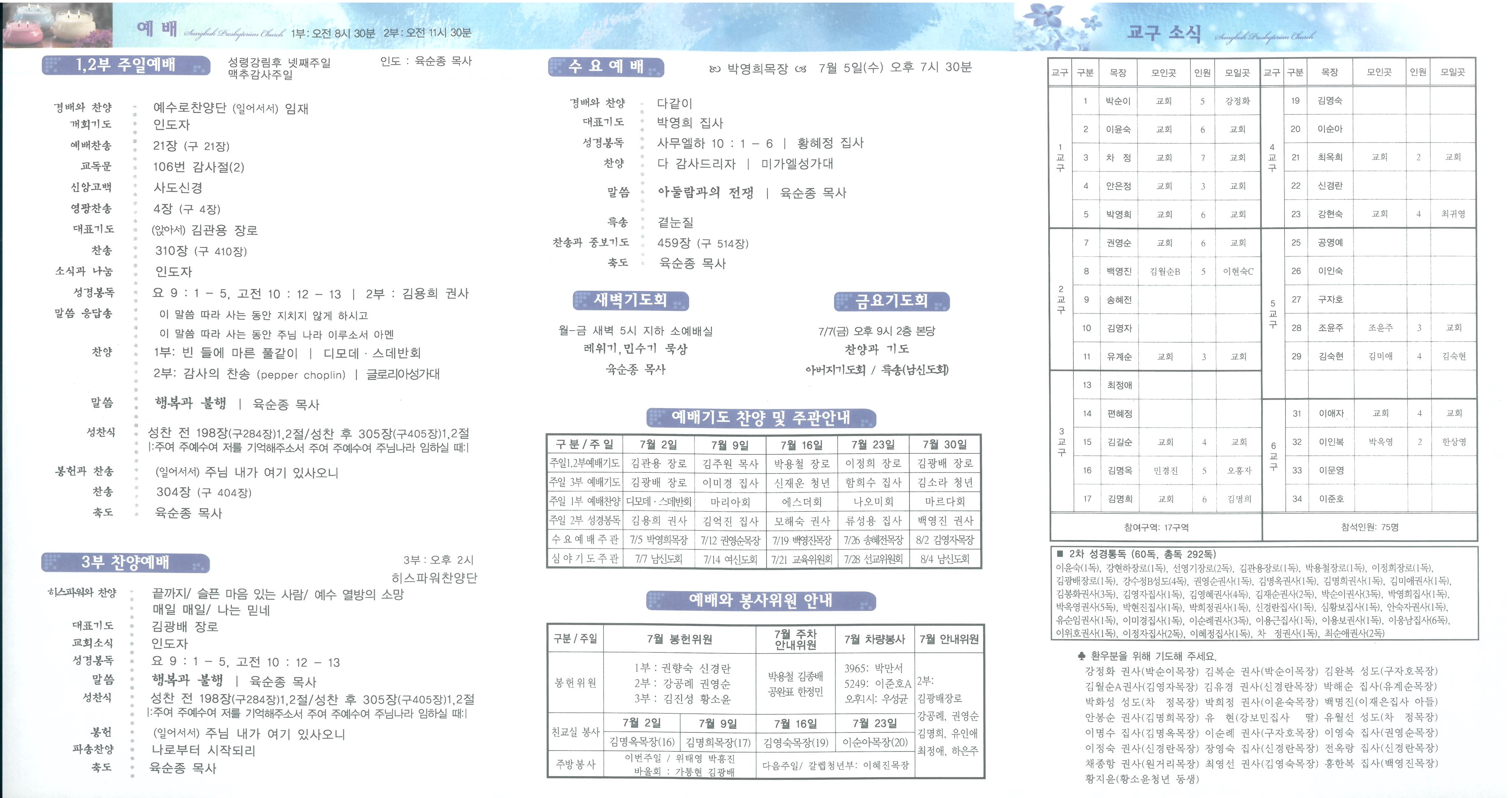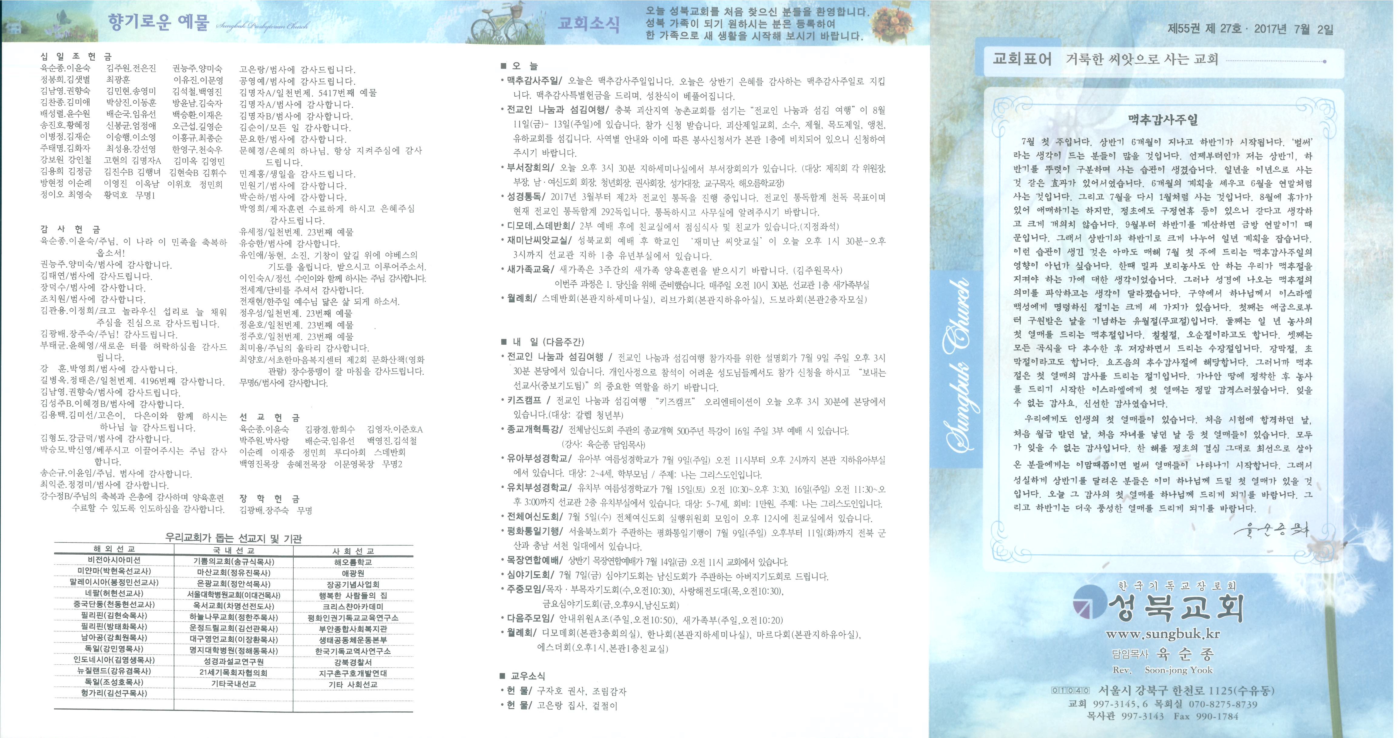 ■ 오 늘 ∙맥추감사주일/ 오늘은 맥추감사주일입니다. 오늘은 상반기 은혜를 감사하는 맥추감사주일로 지킵니다. 맥추감사특별헌금을 드리며, 성찬식이 베풀어집니다. ∙전교인 나눔과 섬김여행/ 충북 괴산지역 농촌교회를 섬기는“전교인 나눔과 섬김 여행”이 8월 11일(금)- 13일(주일)에 있습니다. 참가 신청 받습니다. 괴산제일교회, 소수, 제월, 목도제일, 앵천, 유하교회를 섬깁니다. 사역별 안내와 이에 따른 봉사신청서가 본관 1층에 비치되어 있으니 신청하여 주시기 바랍니다. ∙부서장회의/ 오늘 오후 3시 30분 지하세미나실에서 부서장회의가 있습니다. (대상: 제직회 각 위원장, 부장, 남·여신도회 회장, 청년회장, 권사회장, 성가대장, 교구목자, 해오름학교장) ∙키즈캠프 / 전교인 나눔과 섬김여행 “키즈캠프” 오리엔테이션이 오늘 오후 3시 30분에 본당에서 있습니다.(대상: 갈렙 청년부) ∙성경통독/ 2017년 3월부터 제2차 전교인 통독을 진행 중입니다. 전교인 통독합계 천독 목표이며 현재 전교인 통독합계 292독입니다. 통독하시고 사무실에 알려주시기 바랍니다. ∙디모데.스데반회/ 2부 예배 후에 친교실에서 점심식사 및 친교가 있습니다.(지정좌석) ∙재미난씨앗교실/ 성북교회 예배 후 학교인 ‘재미난 씨앗교실’이 오늘 오후 1시 30분-오후 3시까지 선교관 지하 1층 유년부실에서 있습니다. ∙새가족교육/ 새가족은 3주간의 새가족 양육훈련을 받으시기 바랍니다. (김주원목사) 이번주 과정은 1. 당신을 위해 준비했습니다. 매주일 오전 10시 30분, 선교관 1층 새가족부실 ∙월례회/ 스데반회(본관지하세미나실), 리브가회(본관지하유아실), 드보라회(본관2층자모실) ■ 내 일 (다음주간) ∙전교인 나눔과 섬김여행 / 전교인 나눔과 섬김여행 참가자를 위한 설명회가 7월 9일 주일 오후 3시 30분 본당에서 있습니다. 개인사정으로 참석이 어려운 성도님들께서도 참가 신청을 하시고 “보내는 선교사(중보기도팀)”의 중요한 역할을 하기 바랍니다. ∙종교개혁특강/ 전체남신도회 주관의 종교개혁 500주년 특강이 16일 주일 3부 예배 시 있습니다. (강사: 육순종 담임목사) ∙유아부성경학교/ 유아부 여름성경학교가 7월 9일(주일) 오전 11시부터 오후 2시까지 본관 지하유아부실에서 있습니다. 대상: 2~4세, 학부모님 / 주제: 나는 그리스도인입니다. ∙유치부성경학교/ 유치부 여름성경학교가 7월 15일(토) 오전 10:30~오후 3:30, 16일(주일) 오전 11:30~오후 3:00까지 선교관 2층 유치부실에서 있습니다. 대상: 5~7세, 회비: 1만원, 주제: 나는 그리스도인입니다. ∙전체여신도회/ 7월 5일(수) 전체여신도회 실행위원회 모임이 오후 12시에 친교실에서 있습니다. ∙평화통일기행/ 서울북노회가 주관하는 평화통일기행이 7월 9일(주일) 오후부터 11일(화)까지 전북 군산과 충남 서천 일대에서 있습니다. ∙목장연합예배/ 상반기 목장연합예배가 7월 14일(금) 오전 11시 교회에서 있습니다. ∙심야기도회/ 7월 7일(금) 심야기도회는 남신도회가 주관하는 아버지기도회로 드립니다. ∙주중모임/목자·부목자기도회(수,오전10:30), 사랑해전도대(목,오전10:30), 금요심야기도회(금,오후9시,남신도회) ∙다음주모임/ 안내위원A조(주일,오전10:50), 새가족부(주일,오전10:20) ∙월례회/ 디모데회(본관3층회의실), 한나회(본관지하세미나실), 마르다회(본관지하유아실), 에스더회(오후1시,본관1층친교실) ■ 교우소식 ∙헌 물/ 구자호 권사, 조림감자 ∙헌 물/ 고은랑 집사, 겉절이