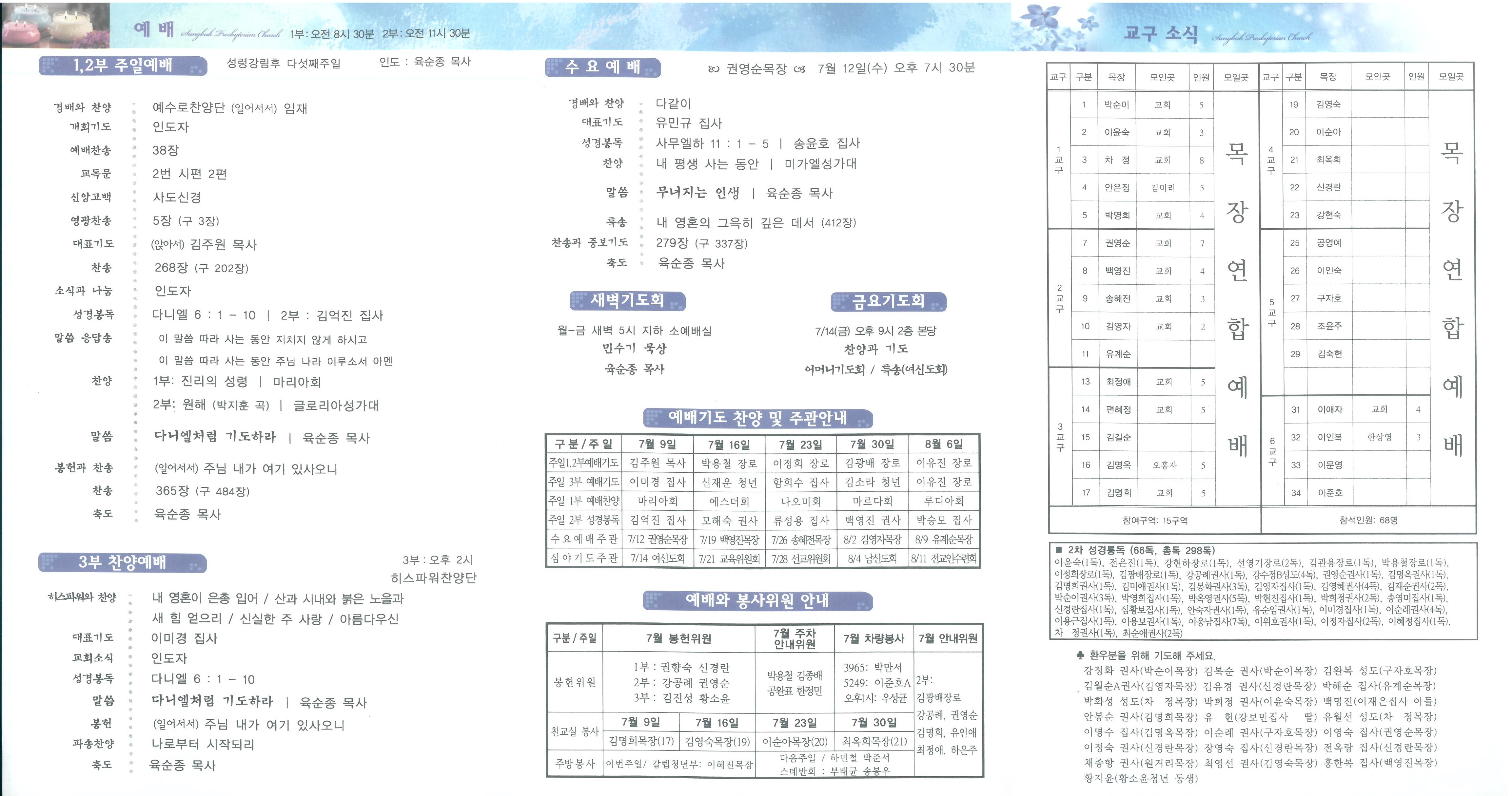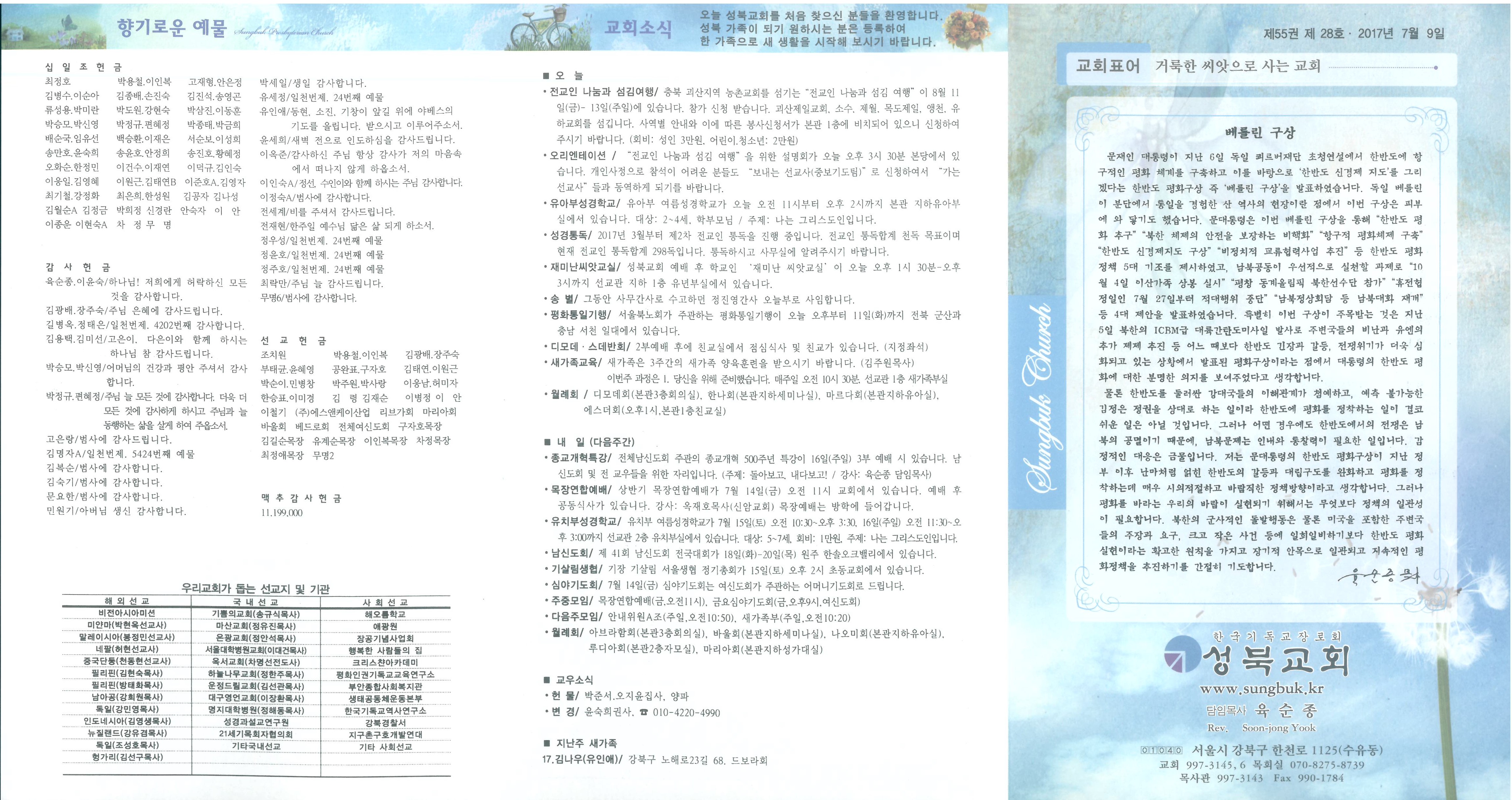 ■ 오 늘 ∙전교인 나눔과 섬김여행/ 충북 괴산지역 농촌교회를 섬기는“전교인 나눔과 섬김 여행”이 8월 11일(금)- 13일(주일)에 있습니다. 참가 신청 받습니다. 괴산제일교회, 소수, 제월, 목도제일, 앵천, 유하교회를 섬깁니다. 사역별 안내와 이에 따른 봉사신청서가 본관 1층에 비치되어 있으니 신청하여 주시기 바랍니다. (회비: 성인 3만원, 어린이.청소년: 2만원) ∙오리엔테이션 / “전교인 나눔과 섬김 여행”을 위한 설명회가 오늘 오후 3시 30분 본당에서 있습니다. 개인사정으로 참석이 어려운 분들도 “보내는 선교사(중보기도팀)”로 신청하여서 “가는 선교사”들과 동역하게 되기를 바랍니다. ∙유아부성경학교/ 유아부 여름성경학교가 오늘 오전 11시부터 오후 2시까지 본관 지하유아부실에서 있습니다. 대상: 2~4세, 학부모님 / 주제: 나는 그리스도인입니다. ∙성경통독/ 2017년 3월부터 제2차 전교인 통독을 진행 중입니다. 전교인 통독합계 천독 목표이며 현재 전교인 통독합계 298독입니다. 통독하시고 사무실에 알려주시기 바랍니다. ∙재미난씨앗교실/ 성북교회 예배 후 학교인 ‘재미난 씨앗교실’이 오늘 오후 1시 30분-오후 3시까지 선교관 지하 1층 유년부실에서 있습니다. ∙송 별/ 그동안 사무간사로 수고하던 정진영간사 오늘부로 사임합니다. ∙평화통일기행/ 서울북노회가 주관하는 평화통일기행이 오늘 오후부터 11일(화)까지 전북 군산과 충남 서천 일대에서 있습니다. ∙디모데·스데반회/ 2부예배 후에 친교실에서 점심식사 및 친교가 있습니다. (지정좌석) ∙새가족교육/ 새가족은 3주간의 새가족 양육훈련을 받으시기 바랍니다. (김주원목사) 이번주 과정은 1. 당신을 위해 준비했습니다. 매주일 오전 10시 30분, 선교관 1층 새가족부실 ∙월례회/ 디모데회(본관3층회의실), 한나회(본관지하세미나실), 마르다회(본관지하유아실), 에스더회(오후1시,본관1층친교실) ■ 내 일 (다음주간) ∙종교개혁특강/ 전체남신도회 주관의 종교개혁 500주년 특강이 16일(주일) 3부 예배 시 있습니다. 남신도회 및 전 교우들을 위한 자리입니다. (주제: 돌아보고, 내다보고! / 강사: 육순종 담임목사) ∙목장연합예배/ 상반기 목장연합예배가 7월 14일(금) 오전 11시 교회에서 있습니다. 예배 후 공동식사가 있습니다.강사: 옥재호목사(신암교회) 목장예배는 방학에 들어갑니다. ∙유치부성경학교/ 유치부 여름성경학교가 7월 15일(토) 오전 10:30~오후 3:30, 16일(주일) 오전 11:30~오후 3:00까지 선교관 2층 유치부실에서 있습니다. 대상: 5~7세, 회비: 1만원, 주제: 나는 그리스도인입니다. ∙남신도회/ 제 41회 남신도회 전국대회가 18일(화)-20일(목) 원주 한솔오크밸리에서 있습니다. ∙기살림생협/ 기장 기살림 서울생협 정기총회가 15일(토) 오후 2시 초동교회에서 있습니다. ∙심야기도회/ 7월 14일(금) 심야기도회는 여신도회가 주관하는 어머니기도회로 드립니다. ∙주중모임/ 목장연합예배(금,오전11시), 금요심야기도회(금,오후9시,여신도회) ∙다음주모임/ 안내위원A조(주일,오전10:50), 새가족부(주일,오전10:20) ∙월례회/ 아브라함회(본관3층회의실), 바울회(본관지하세미나실), 나오미회(본관지하유아실), 루디아회(본관2층자모실), 마리아회(본관지하성가대실) ■ 교우소식 ∙헌 물/ 박준서.오지윤집사, 양파 ∙변 경/ 윤숙희권사, ☎ 010-4220-4990 ■ 지난주 새가족 17.김나우(유인애)/ 강북구 노해로23길 68. 드보라회