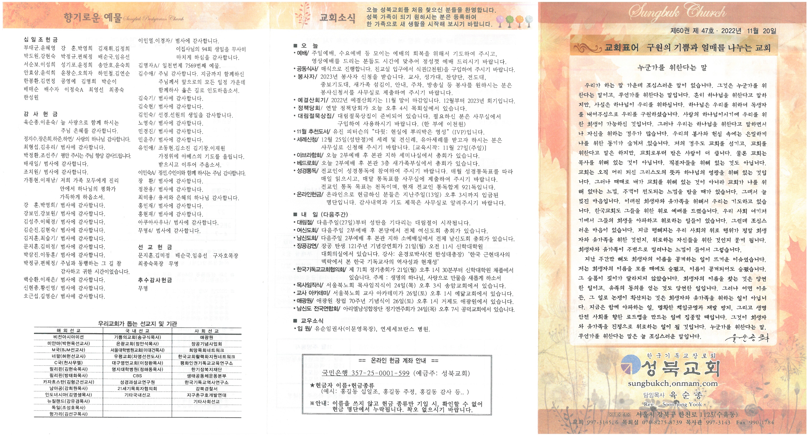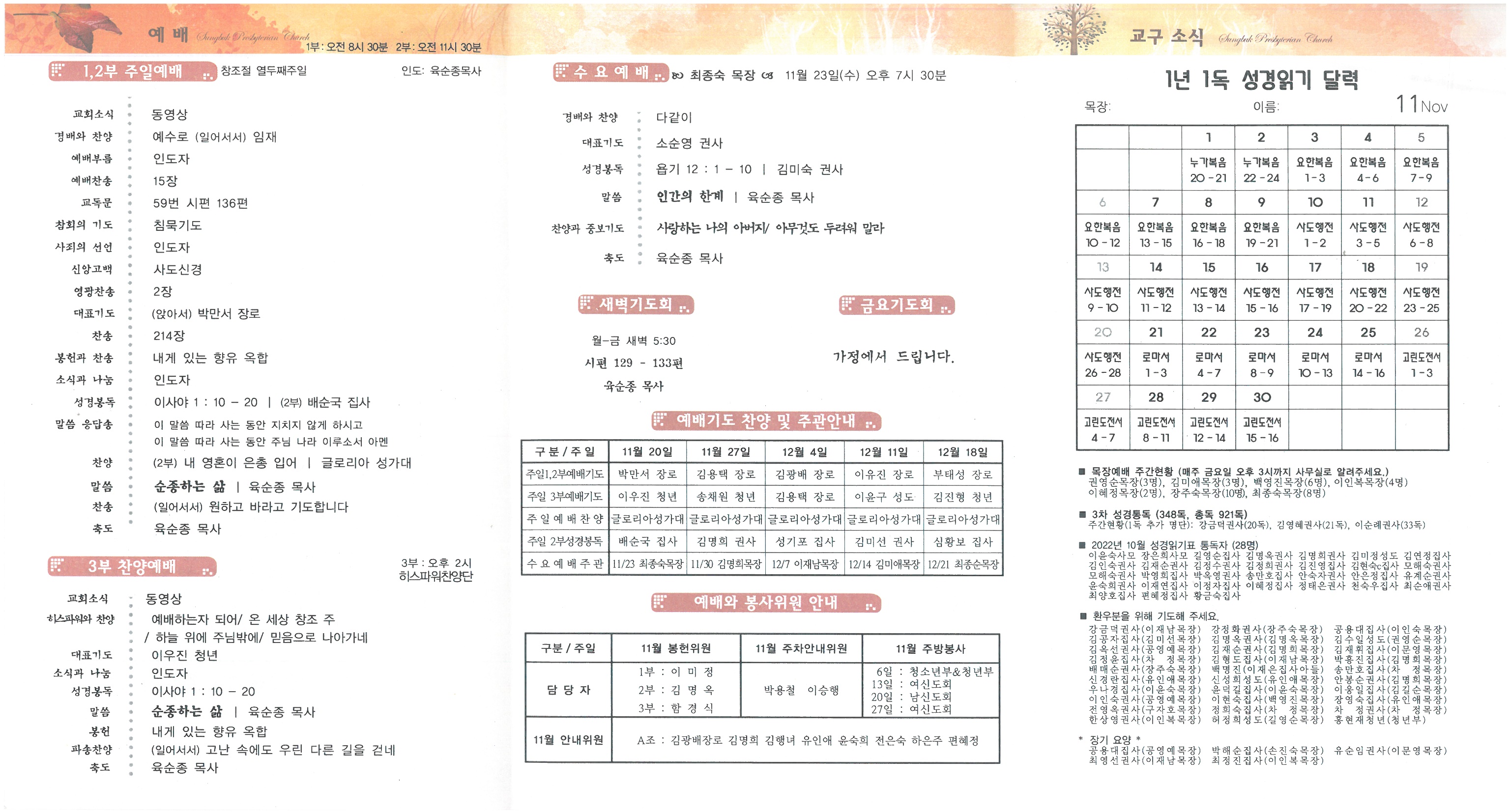 ∙예배/ 주일예배, 수요예배 등 모이는 예배의 회복을 위해서 기도하여 주시고, 영상예배를 드리는 분들도 시간에 맞추어 정성껏 예배 드리시기 바랍니다. ∙공동식사/ 매식으로 진행합니다. 친교실 입구에서 식권(2천원)을 구입하여 주시기 바랍니다. ∙봉사자/ 2023년 봉사자 신청을 받습니다. 교사, 성가대, 찬양단, 전도대, 중보기도대, 새가족 섬김이, 안내, 주차, 방송실 등 봉사를 원하시는 분은 봉사신청서를 사무실로 제출하여 주시기 바랍니다. ∙예결산회기/ 2022년 예결산회기는 11월 말이 마감입니다. 12월부터 2023년 회기입니다. ∙정책당회/ 연말 정책당회가 오늘 오후 4시 목회실에서 있습니다. ∙대림절묵상집/ 대림절묵상집이 준비되어 있습니다. 필요하신 분은 사무실에서 구입하여 사용하시기 바랍니다. (한 부에 이천원) ∙11월 추천도서/ 유진 피터슨의“다윗: 현실에 뿌리박은 영성”(IVP)입니다. ∙세례신청/ 12월 25일(성탄절)에 세례 및 견신례, 유아세례를 받고자 하시는 분은 사무실로 신청해 주시기 바랍니다. [교육시작: 11월 27일(주일)] ∙아브라함회/ 오늘 2부예배 후 본관 지하 세미나실에서 총회가 있습니다. ∙베드로회/ 오늘 2부예배 후 본관 3층 새가족부실에서 총회가 있습니다. ∙성경통독/ 전교인이 성경통독에 참여하여 주시기 바랍니다. 매월 성경통독표를 따라 매일 읽으시고, 매달 통독표를 사무실에 제출하여 주시기 바랍니다. 전교인 통독 목표는 천독이며, 현재 전교인 통독합계 921독입니다. ∙온라인헌금/ 온라인으로 헌금하신 분들은 지난주일(13일) 오후 3시까지 입금된 명단입니다. 감사내역과 기도 제목은 사무실로 알려주시기 바랍니다.