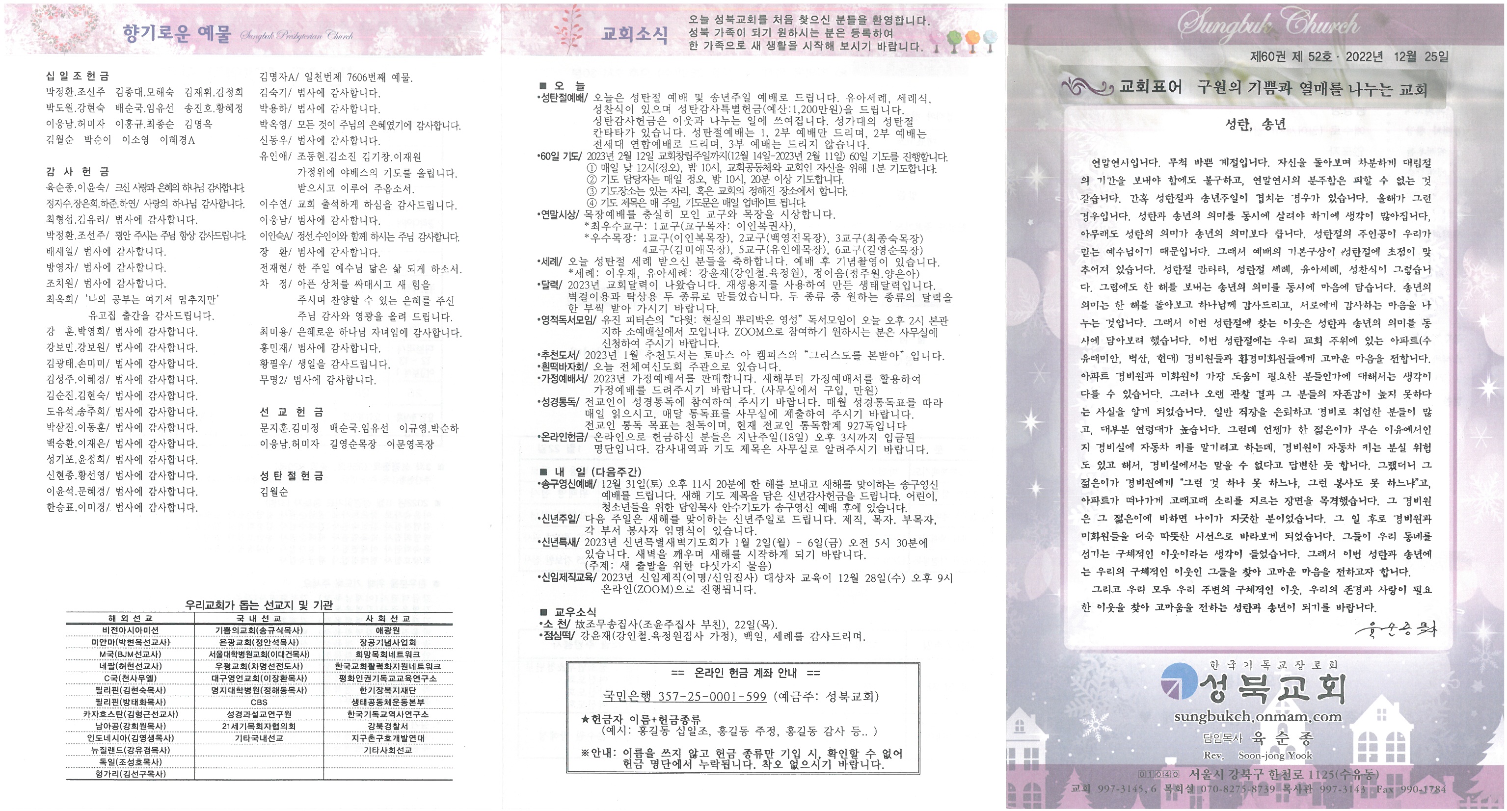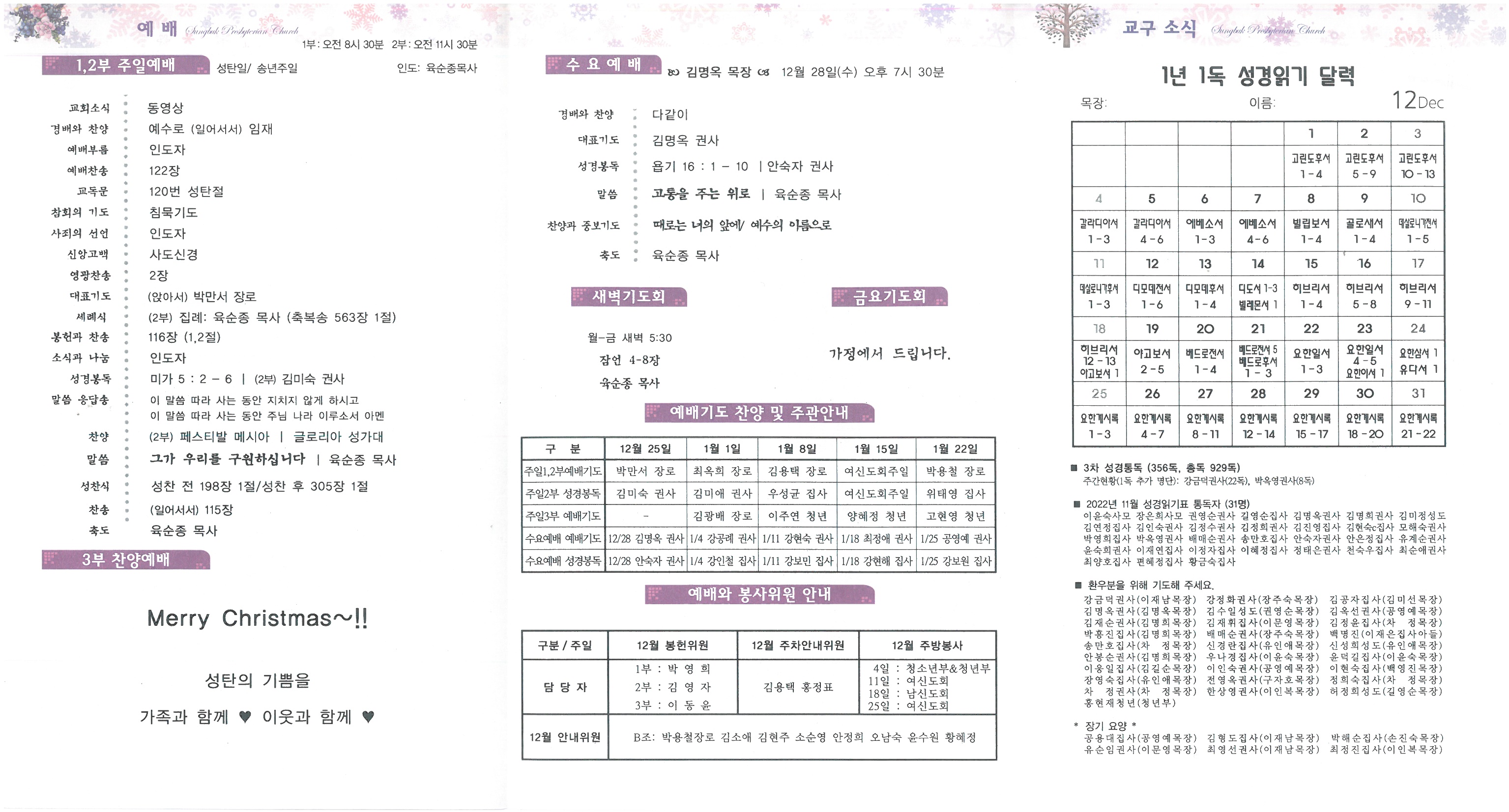 ∙성탄절예배/ 오늘은 성탄절 예배 및 송년주일 예배로 드립니다. 유아세례, 세례식, 성찬식이 있으며 성탄감사특별헌금(예산:1,200만원)을 드립니다. 성탄감사헌금은 이웃과 나누는 일에 쓰여집니다. 성가대의 성탄절 칸타타가 있습니다. 성탄절예배는 1, 2부 예배만 드리며, 2부 예배는 전세대 연합예배로 드리며, 3부 예배는 드리지 않습니다. ∙60일 기도/ 2023년 2월 12일 교회창립주일까지(12월 14일-2023년 2월 11일) 60일 기도를 진행합니다. ① 매일 낮 12시(정오), 밤 10시, 교회공동체와 교회인 자신을 위해 1분 기도합니다. ② 기도 담당자는 매일 정오, 밤 10시, 20분 이상 기도합니다. ③ 기도장소는 있는 자리, 혹은 교회의 정해진 장소에서 합니다. ④ 기도 제목은 매 주일, 기도문은 매일 업데이트 됩니다. ∙연말시상/ 목장예배를 충실히 모인 교구와 목장을 시상합니다. *최우수교구: 1교구(교구목자: 이인복권사), *우수목장: 1교구(이인복목장), 2교구(백영진목장), 3교구(최종숙목장) 4교구(김미애목장), 5교구(유인애목장), 6교구(길영순목장) ∙세례/ 오늘 성탄절 세례 받으신 분들을 축하합니다. 예배 후 기념촬영이 있습니다. *세례: 이우재, 유아세례: 강윤재(강인철.육정원), 정이음(정주원.양은아) ∙달력/ 2023년 교회달력이 나왔습니다. 재생용지를 사용하여 만든 생태달력입니다. 벽걸이용과 탁상용 두 종류로 만들었습니다. 두 종류 중 원하는 종류의 달력을 한 부씩 받아 가시기 바랍니다. ∙영적독서모임/ 유진 피터슨의“다윗: 현실의 뿌리박은 영성”독서모임이 오늘 오후 2시 본관 지하 소예배실에서 모입니다. ZOOM으로 참여하기 원하시는 분은 사무실에 신청하여 주시기 바랍니다. ∙추천도서/ 2023년 1월 추천도서는 토마스 아 켐피스의“그리스도를 본받아”입니다. ∙흰떡바자회/ 오늘 전체여신도회 주관으로 있습니다. ∙가정예배서/ 2023년 가정예배서를 판매합니다. 새해부터 가정예배서를 활용하여 가정예배를 드려주시기 바랍니다. (사무실에서 구입, 만원) ∙성경통독/ 전교인이 성경통독에 참여하여 주시기 바랍니다. 매월 성경통독표를 따라 매일 읽으시고, 매달 통독표를 사무실에 제출하여 주시기 바랍니다. 전교인 통독 목표는 천독이며, 현재 전교인 통독합계 927독입니다 ∙온라인헌금/ 온라인으로 헌금하신 분들은 지난주일(18일) 오후 3시까지 입금된 명단입니다. 감사내역과 기도 제목은 사무실로 알려주시기 바랍니다.