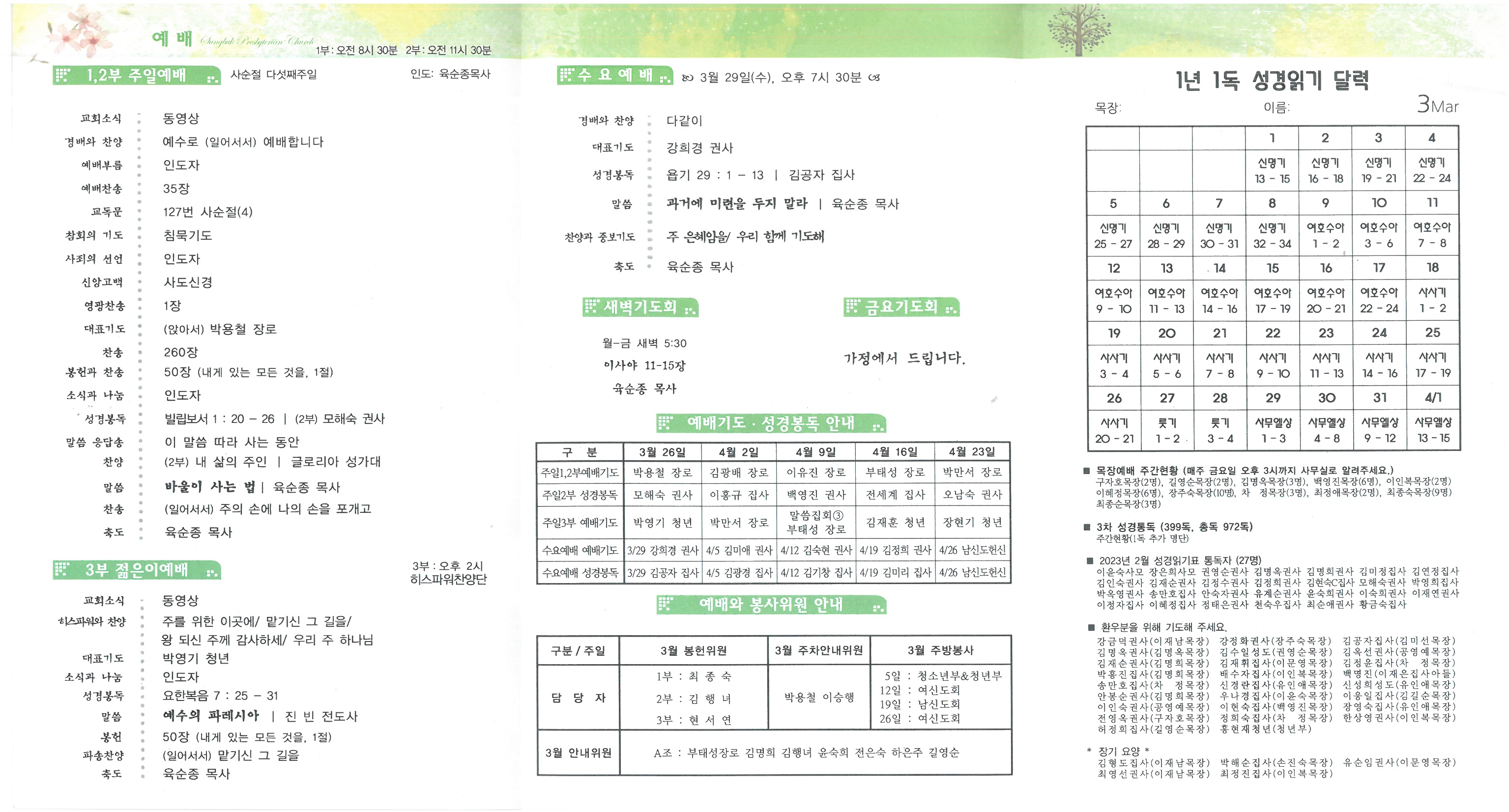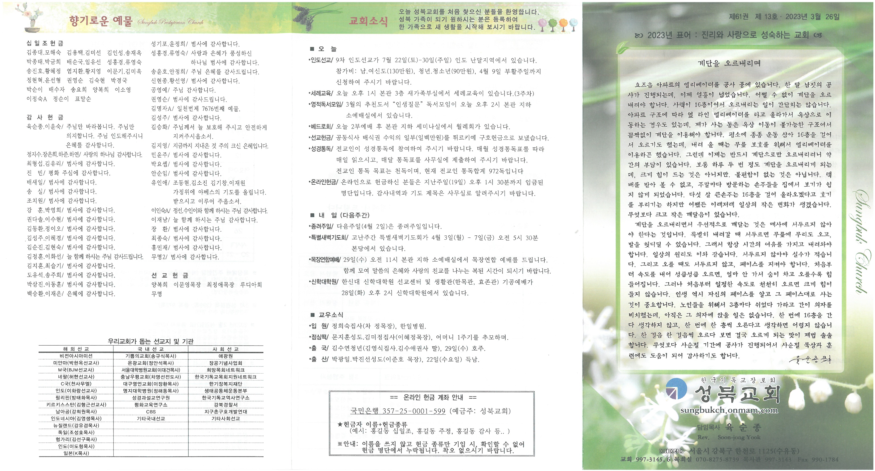 ∙인도선교/ 9차 인도선교가 7월 22일(토)-30일(주일) 인도 난달지역에서 있습니다. 참가비: 남.여신도(130만원), 청년.청소년(90만원), 4월 9일 부활주일까지 신청하여 주시기 바랍니다. ∙세례교육/ 오늘 오후 1시 본관 3층 새가족부실에서 세례교육이 있습니다.(3주차) ∙영적독서모임/ 3월의 추천도서“인생질문”독서모임이 오늘 오후 2시 본관 지하 소예배실에서 있습니다. ∙베드로회/ 오늘 2부예배 후 본관 지하 세미나실에서 월례회가 있습니다. ∙선교헌금/ 공동식사 배식권 수익의 일부(일백만원)를 튀르키예 구호헌금으로 보냈습니다. ∙성경통독/ 전교인이 성경통독에 참여하여 주시기 바랍니다. 매월 성경통독표를 따라 매일 읽으시고, 매달 통독표를 사무실에 제출하여 주시기 바랍니다. 전교인 통독 목표는 천독이며, 현재 전교인 통독합계 972독입니다 ∙온라인헌금/ 온라인으로 헌금하신 분들은 지난주일(19일) 오후 1시 30분까지 입금된 명단입니다. 감사내역과 기도 제목은 사무실로 알려주시기 바랍니다.