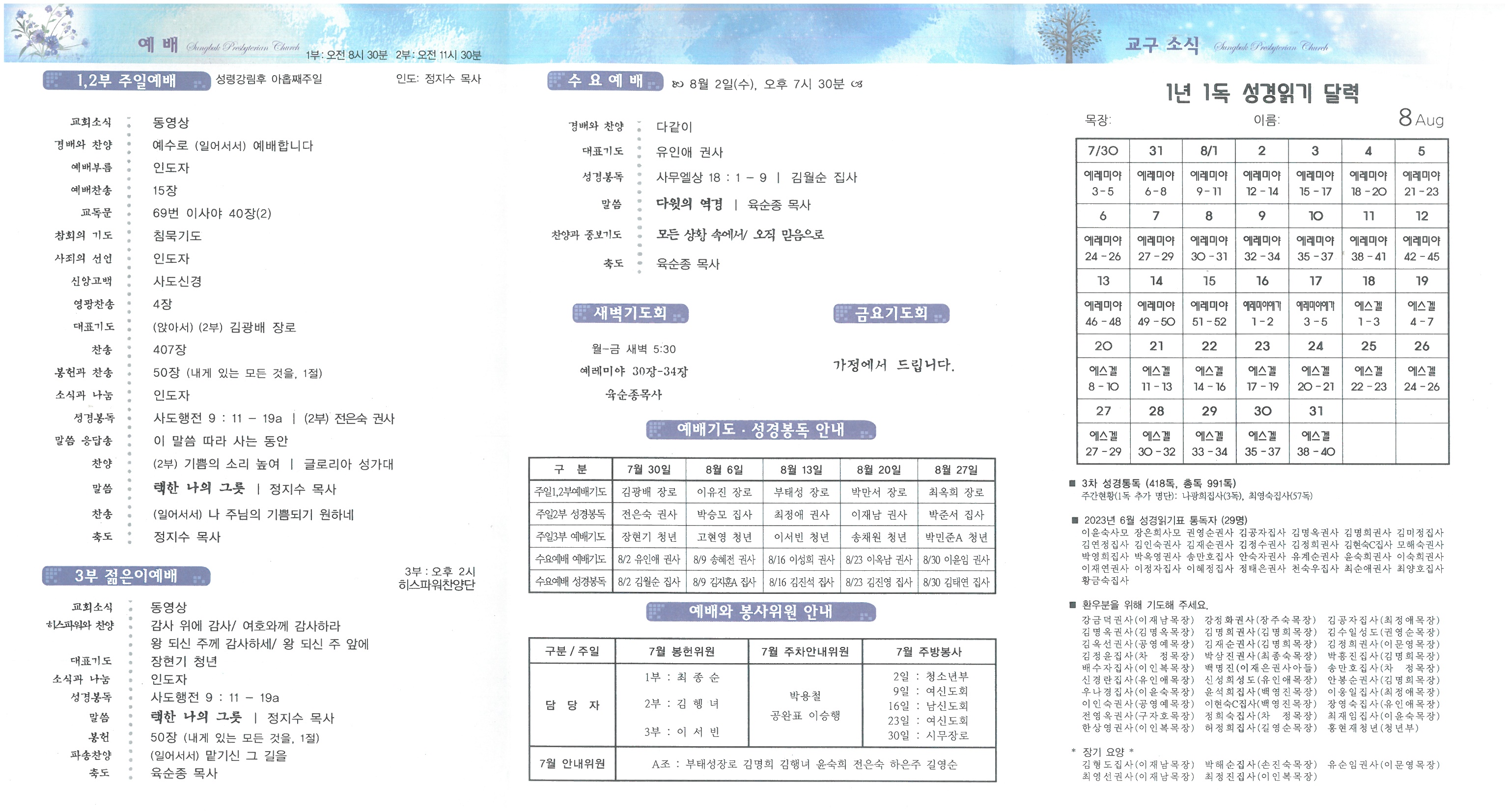 ∙인도선교/ 제 9차 인도선교를 은혜가운데 마치고 오늘 귀국합니다. 무사히 돌아올 수 있도록 기도하여 주시기 바랍니다. 인도선교를 위해 기도하고 후원해 주신 분들께 감사드립니다. ∙인도선교릴레이기도/ 제 9차 인도선교를 위한 릴레이기도가 오늘까지 진행됩니다. ∙수해/ 수해를 입은 이웃을 위해서 기도해 주시기 바랍니다. ∙성경통독/ 전교인이 성경통독에 참여하여 주시기 바랍니다. 매월 성경통독표를 따라 매일 읽으시고, 매달 통독표를 사무실에 제출하여 주시기 바랍니다. 전교인 통독 목표는 천독이며, 현재 전교인 통독합계 991독입니다 ∙온라인헌금/ 온라인으로 헌금하신 분들은 23일(주일) 오후 1시 30분까지 입금된 명단입니다. 감사내역과 기도 제목은 사무실로 알려주시기 바랍니다.