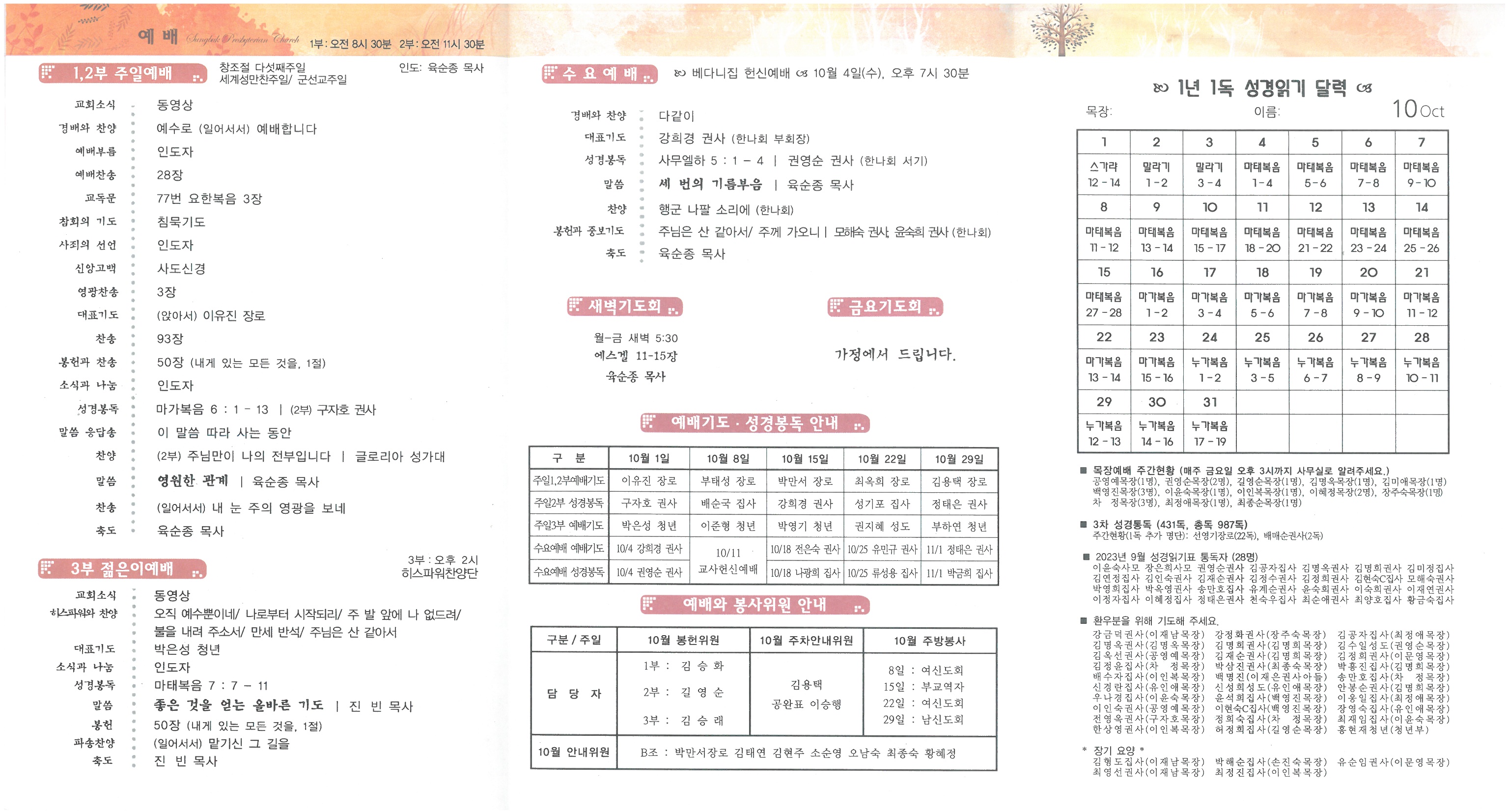■ 내 일 (다음주간) ∙추수감사주일/ 10월 29일(주일)은 추수감사주일입니다. 추수감사주일에 전교인 감사축제와 성경퀴즈대회가 있습니다. 성경퀴즈 범위는 마태복음과 룻기이며 교구별, 목장별, 개인별 우수팀을 시상합니다.(추후 상세 안내) 준비된 부서의 찬양발표 등이 있습니다. ∙목장연합예배/ 4일(수) 오전 11시 본관 지하 소예배실에서 목장연합예배를 드립니다. 함께 모여 말씀의 은혜와 사랑의 친교를 나누는 복된 시간이 되시기 바랍니다. ∙정기제직회/ 다음 주일(9일) 2부 예배 후 10월 정기제직회로 모입니다.