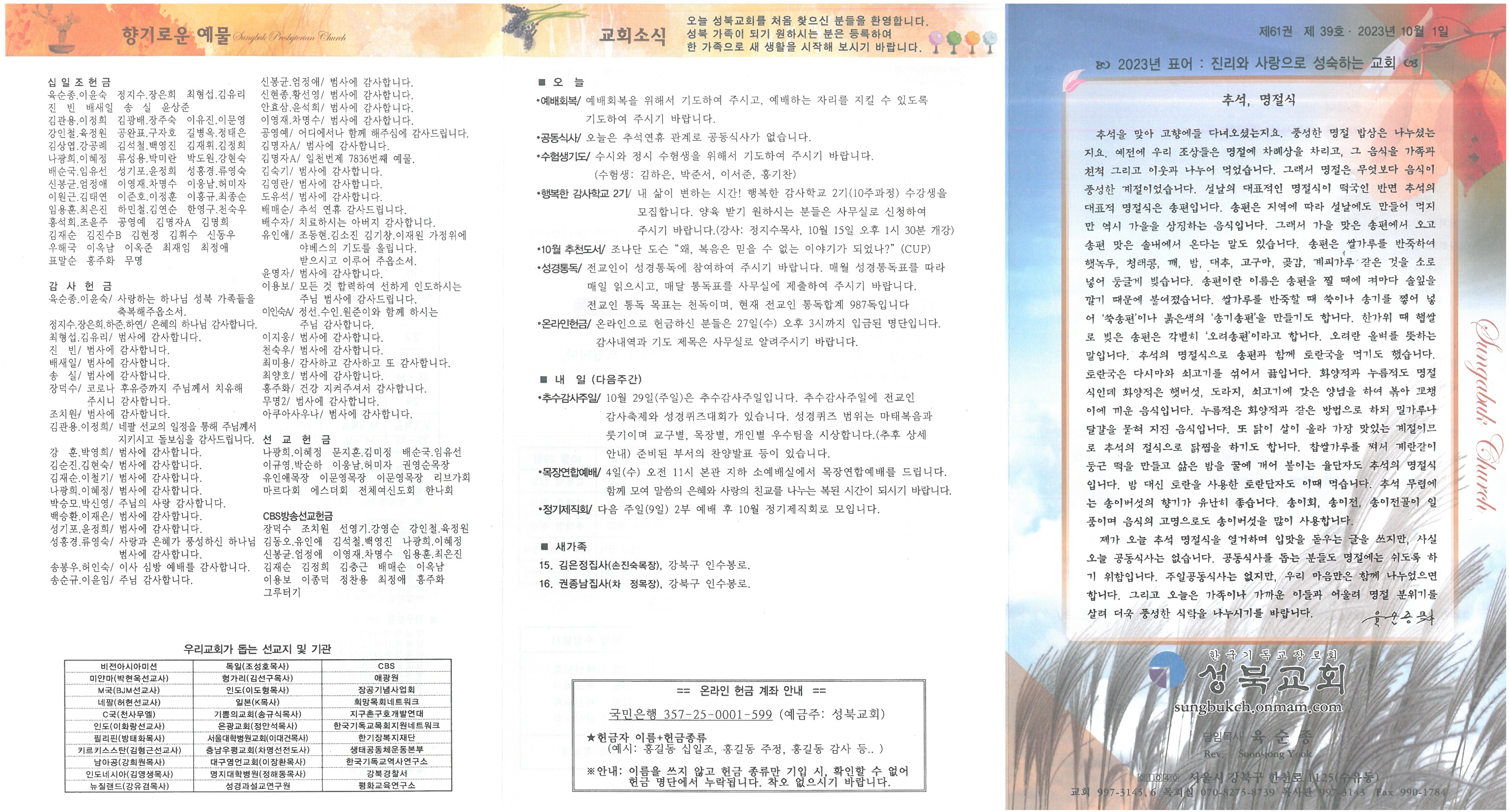 ∙예배회복/ 예배회복을 위해서 기도하여 주시고, 예배하는 자리를 지킬 수 있도록 기도하여 주시기 바랍니다. ∙공동식사/ 오늘은 추석연휴 관계로 공동식사가 없습니다. ∙수험생기도/ 수시와 정시 수험생을 위해서 기도하여 주시기 바랍니다. (수험생: 김하은, 박준서, 이서준, 홍기찬) ∙행복한 감사학교 2기/ 내 삶이 변하는 시간! 행복한 감사학교 2기(10주과정) 수강생을 모집합니다. 양육 받기 원하시는 분들은 사무실로 신청하여 주시기 바랍니다.(강사: 정지수목사, 10월 15일 오후 1시 30분 개강) ∙10월 추천도서/ 조나단 도슨“왜, 복음은 믿을 수 없는 이야기가 되었나?”(CUP) ∙성경통독/ 전교인이 성경통독에 참여하여 주시기 바랍니다. 매월 성경통독표를 따라 매일 읽으시고, 매달 통독표를 사무실에 제출하여 주시기 바랍니다. 전교인 통독 목표는 천독이며, 현재 전교인 통독합계 987독입니다 ∙온라인헌금/ 온라인으로 헌금하신 분들은 27일(수) 오후 3시까지 입금된 명단입니다. 감사내역과 기도 제목은 사무실로 알려주시기 바랍니다.