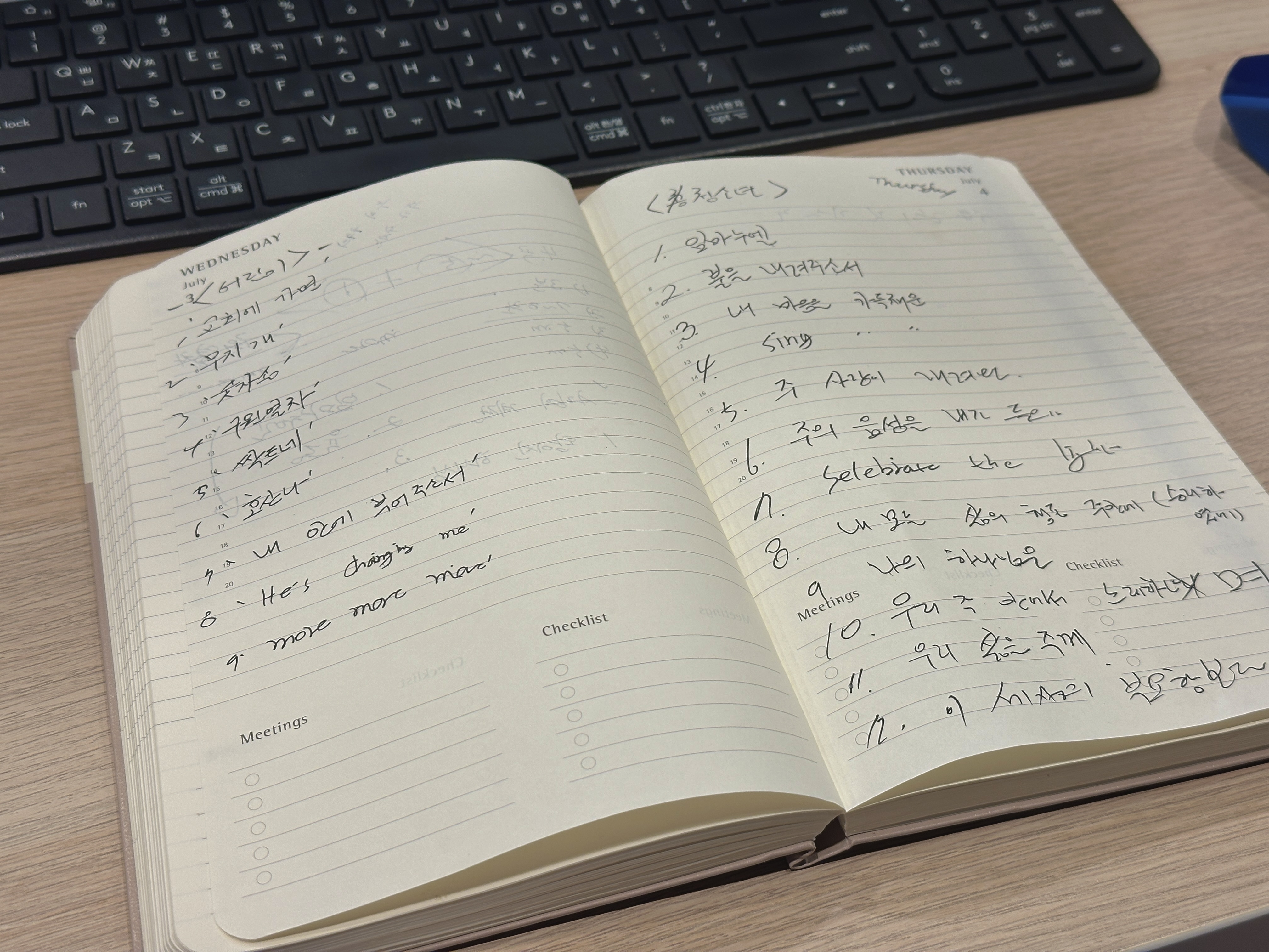 이렇게 정하고 회의를 마쳤습니다. 사실 각자 하고 싶은 곡이 많아서 논쟁이 될까 염려가 되기도 하지만, 좋은 길로 인도하실 주님을 의지해 봅니다. 가끔 보면, 청소년들이 가요보다 찬양을 더 많이 듣고 있는 것 같습니다. 힘든 학교생활을 찬양으로 이겨내고 있는 것이라고 저는 믿습니다.