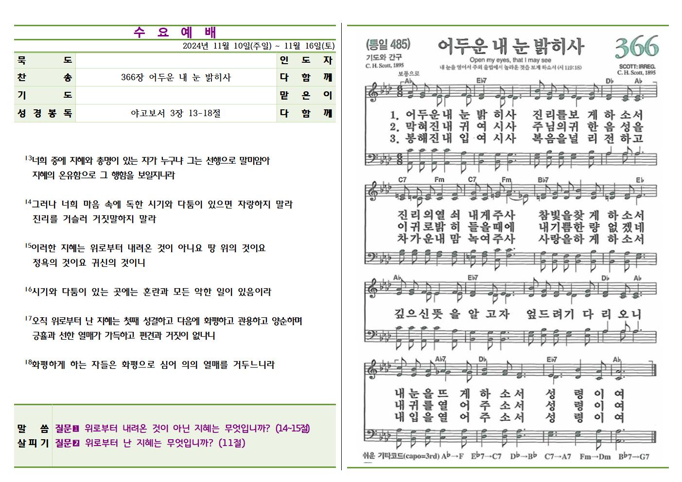 | 묵 도 : 인도자 | 찬 송 : 366장 어두운 내 눈 밝히사 | 기 도 : 맡은이 13 너희 중에 지혜와 총명이 있는 자가 누구냐 그는 선행으로 말미암아 지혜의 온유함으로 그 행함을 보일지니라 14 그러나 너희 마음 속에 독한 시기와 다툼이 있으면 자랑하지 말라 진리를 거슬러 거짓말하지 말라 15 이러한 지혜는 위로부터 내려온 것이 아니요 땅 위의 것이요 정욕의 것이요 귀신의 것이니 16 시기와 다툼이 있는 곳에는 혼란과 모든 악한 일이 있음이라 17 오직 위로부터 난 지혜는 첫째 성결하고 다음에 화평하고 관용하고 양순하며 긍휼과 선한 열매가 가득하고 편견과 거짓이 없나니 18 화평하게 하는 자들은 화평으로 심어 의의 열매를 거두느니라