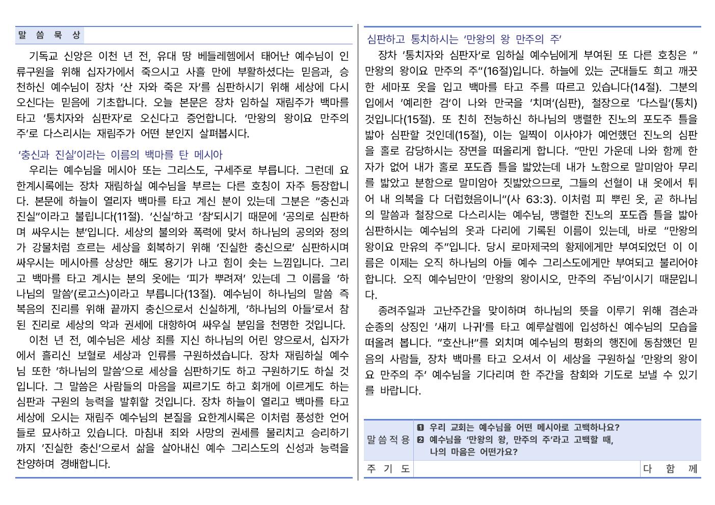 | 제 목 : 심판하고 통치하시는 백마를 탄 메시야 | 묵 도 : 인도자 | 찬 송 : 150장 갈보리 산 위에 | 기 도 : 맡은이 | 성경봉독 : 요한계시록 19장 11 - 16절 11 또 내가 하늘이 열린 것을 보니 보라 백마와 그것을 탄 자가 있으니 그 이름은 충신과 진실이라 그가 공의로 심판하며 싸우더라 12 그 눈은 불꽃 같고 그 머리에는 많은 관들이 있고 또 이름 쓴 것 하나가 있으니 자기밖에 아는 자가 없고 13 또 그가 피 뿌린 옷을 입었는데 그 이름은 하나님의 말씀이라 칭하더라 14 하늘에 있는 군대들이 희고 깨끗한 세마포 옷을 입고 백마를 타고 그를 따르더라 15 그의 입에서 예리한 검이 나오니 그것으로 만국을 치겠고 친히 그들을 철장으로 다스리며 또 친히 하나님 곧 전능하신 이의 맹렬한 진노의 포도주 틀을 밟겠고 16 그 옷과 그 다리에 이름을 쓴 것이 있으니 만왕의 왕이요 만주의 주라 하였더라
