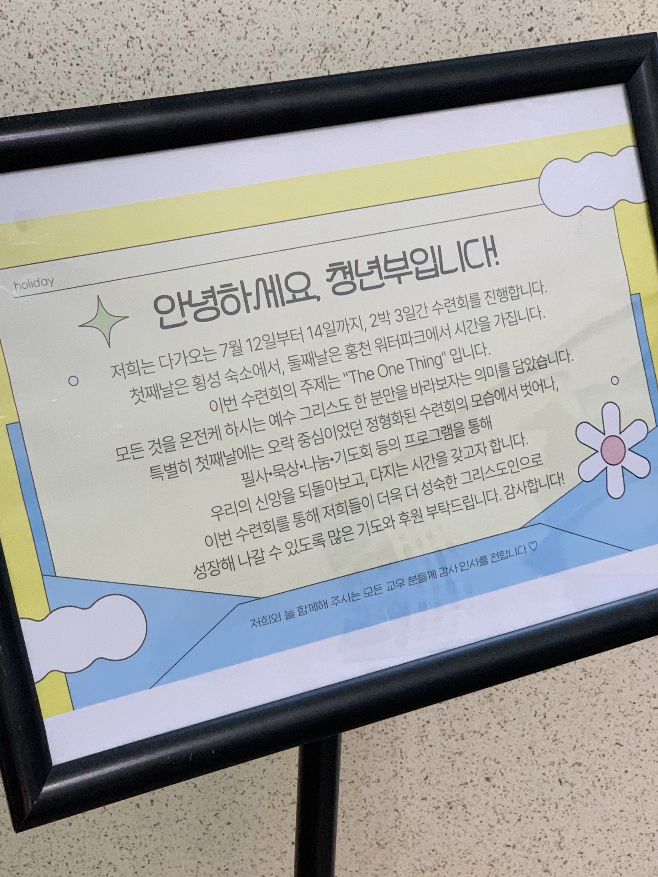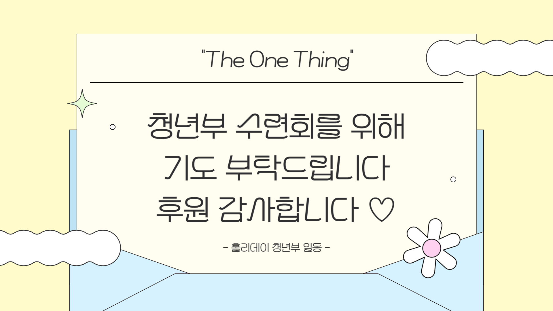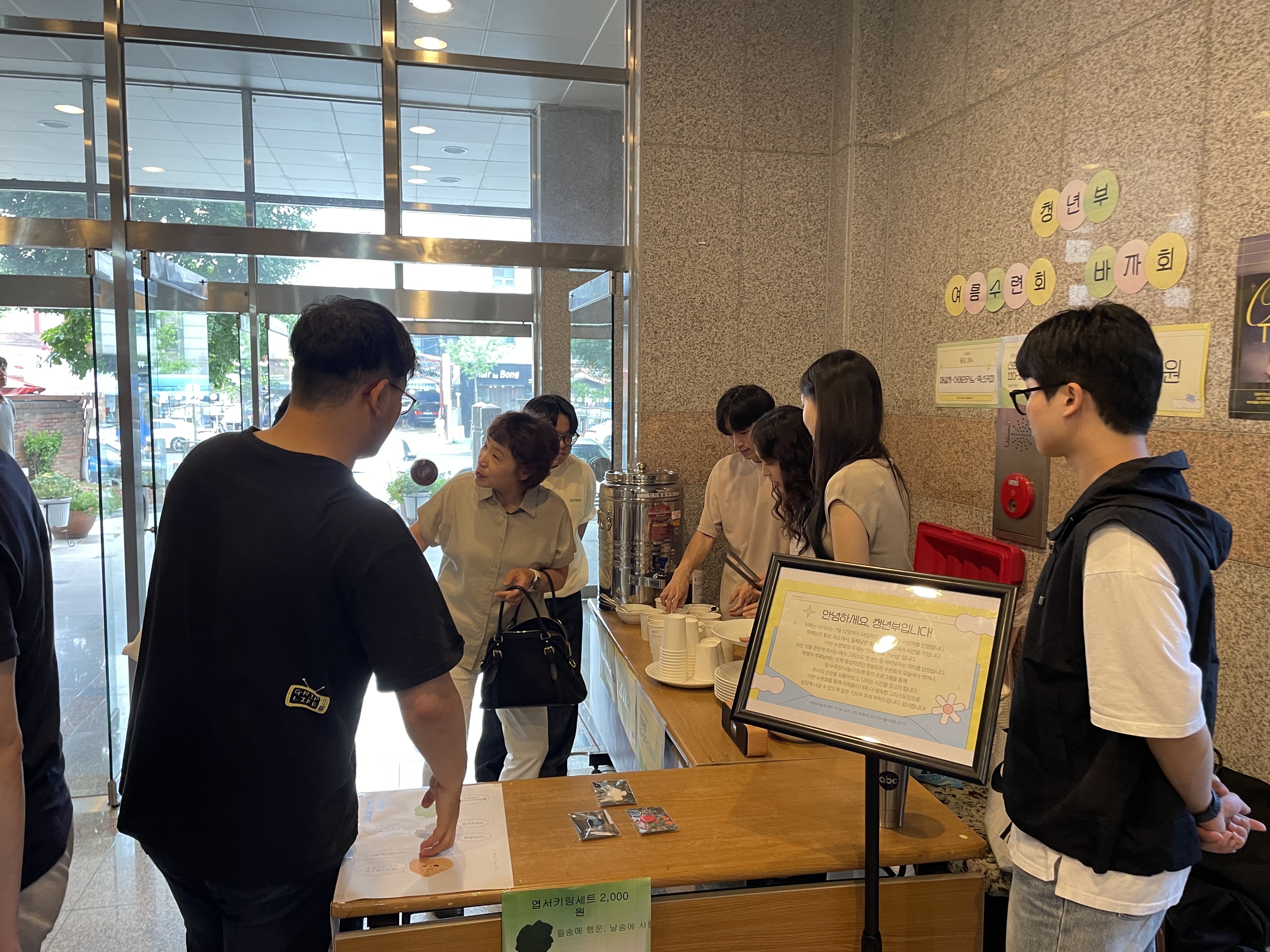 지난 6월 30일! 청년부 수련회 후원 및 격려를 위한 바자회를 진행했습니다! 많은 교우분들이 뜨거운 관심을 가져주셨습니다. 이번 품목에는 핫이슈가 된 품목이 있었는데요~! 바로 박은성 청년이 직접 만든 키링입니다! 말씀 엽서와 함께 담긴 키링은 조기 품절이 되었습니다>< 바자회를 위해 준비한 손길이 있겠죠?? 어린이부에서 자체 강습회를 끝낸 후 피곤할 법도 하지만 혜윤, 주연, 준서 청년이 섬겨주셨습니다! 저희는 다가오는 7월 12일부터 14일까지, 2박 3일간 수련회를 진행합니다. 첫째날은 횡성 숙소에서, 둘째날은 홍천 워터파크에서 시간을 가집니다. 이번 수련회의 주제는 "The One Thing" 입니다. 모든 것을 온전케 하시는 예수 그리스도 한 분만을 바라보자는 의미를 담았습니다. 특별히 첫째날에는 오락 중심이었던 정형화된 수련회의 모습에서 벗어나, 필사∙묵상∙나눔∙기도회 등의 프로그램을 통해 우리의 신앙을 되돌아보고, 다지는 시간을 갖고자 합니다. 이번 수련회를 통해 저희들이 더욱 더 성숙한 그리스도인으로 성장해 나갈 수 있도록 많은 기도와 후원 부탁드립니다. 감사합니다! |