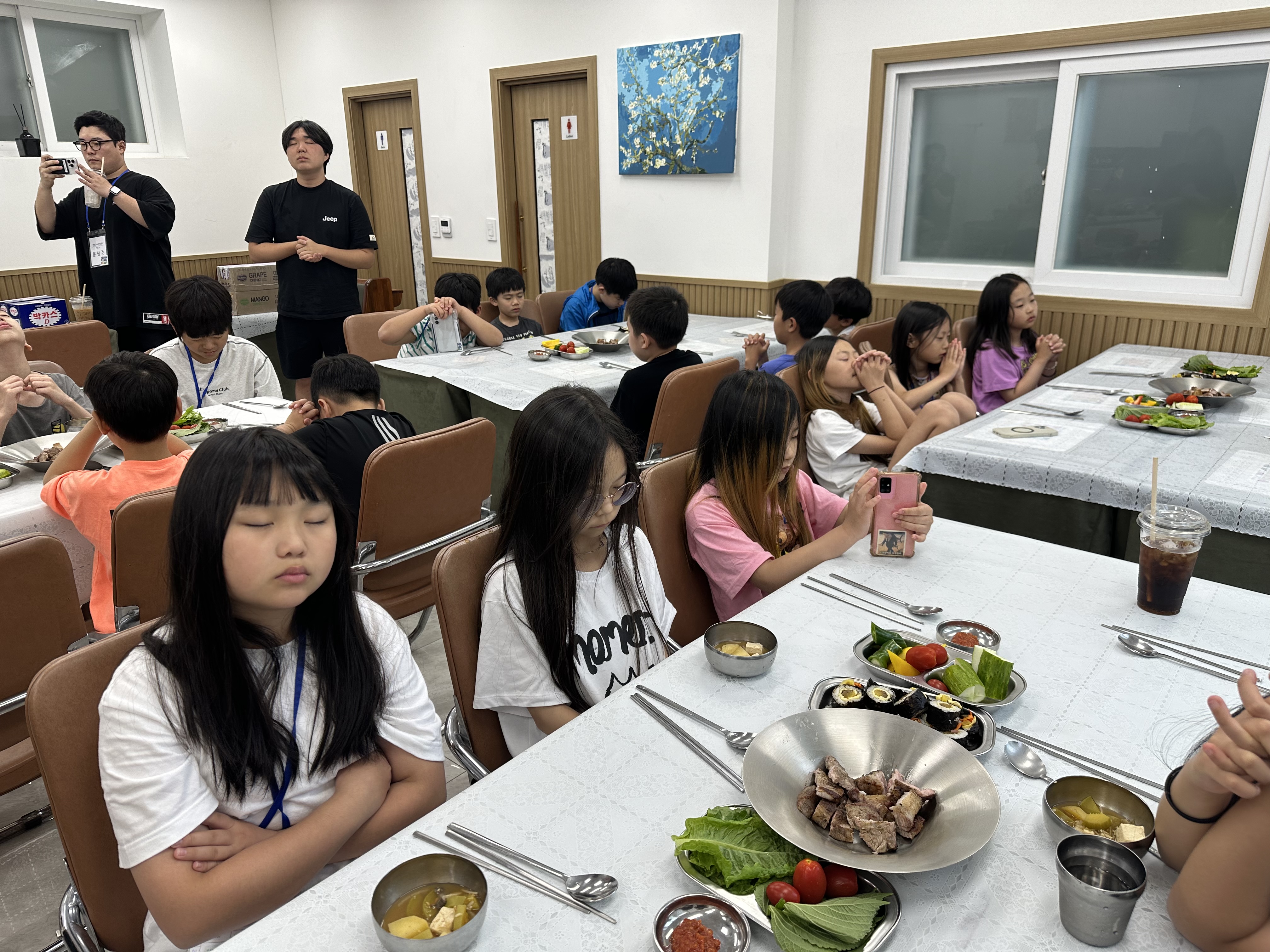 모든 아이들과 선생님들이 마음을 모아 함께 기도하였습니다. ![]() ![]() ![]() ![]() ![]() ![]() ![]() ![]() ![]() ![]() ![]() ![]() 7. 야식 및 취침 어느덧 사랑과 은혜가 가득했던 성경학교의 마지막 밤이 찾아왔습니다.